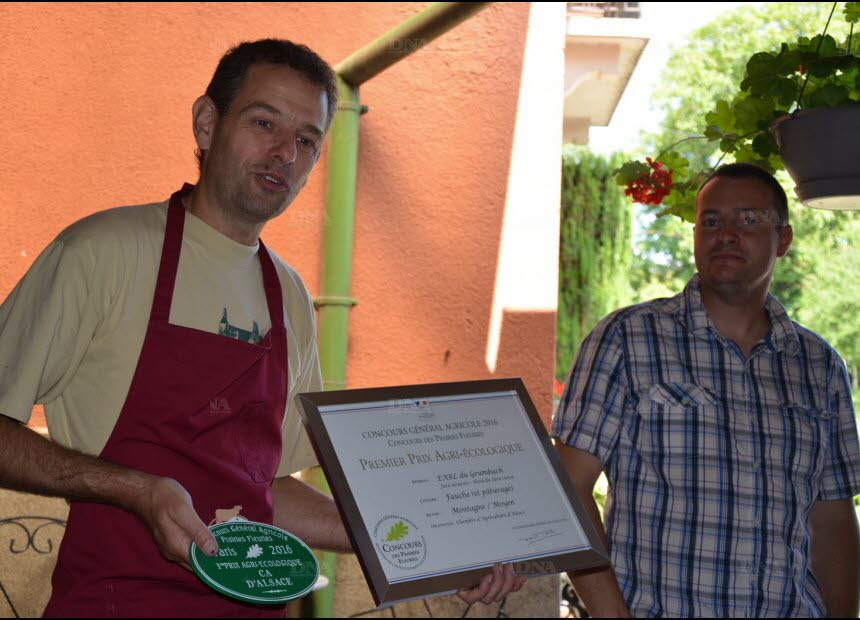Lauréat l’an passé avec sa ferme du Grumbach à Durlinsdorf, il a reçu une plaquette commémorative ovale en métal comme celles qui ornaient autrefois les étables et un diplôme qui fera toujours joli dans un cadre. Mais ce n’est pas cela que retient Nicolas Gerster. « Ce fut une belle aventure que de participer, puis d’être sélectionné et d’aller au Salon de l’agriculture à Paris, parmi une cinquantaine de concurrents venus de toute la France, pour recevoir notre prix. Assurément, c’est bien de mettre celui-ci dans le magasin, car il est un label auprès de notre clientèle séduite par le principe de la vente directe. Surtout, il atteste de notre démarche, du fait que nous avons renoncé au labour pour laisser nos bêtes en pâtures. Beaucoup de gens ne le savent pas, mais nous avons une belle région aussi pour les agriculteurs. Nous n’utilisons que des engrais organiques avec une fauche tardive qui favorise la diversité de la prairie et par conséquent, la qualité du fourrage, qui vient d’une belle parcelle en clairière sur Bendorf. C’est un label de qualité et de sérieux ! ».